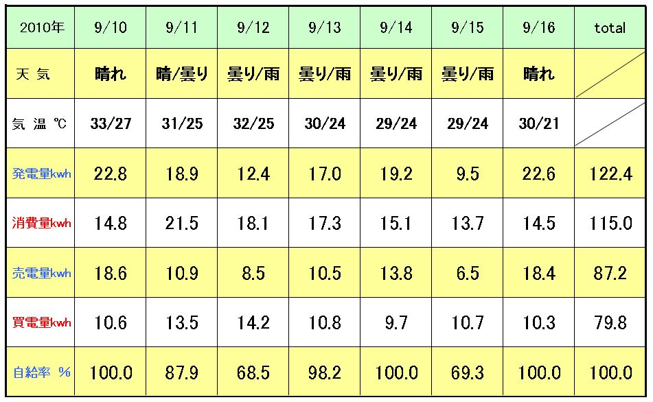 今週の我が家の発電・売電量ですが、週5日曇りや雨で発電量で122.4kwhでした。8月の晴天続きの週と比較すると76%程度の発電量です。消費電力115.0kwh自給率100%で、売電額は48×87.2=4,186円となりました。